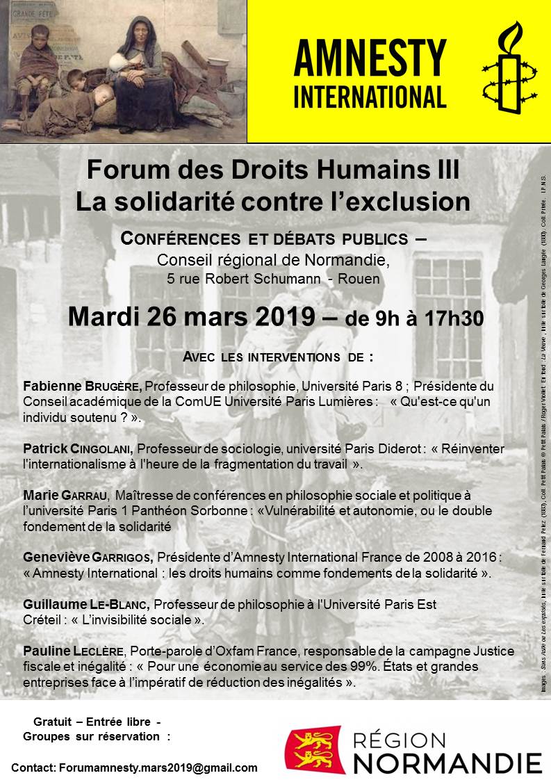 L'actualité des droits humains par Amnesty International-Evreux, spéciale "Journée internationale des Droits des Femmes": Amérique centrale: migrantes et réfugiées; Arabie saoudite: 3 femmes en prison pour avoir défendu le droit de conduire; France: des femmes africaines demandent l'asile pour être protégées de l'excision; Belgique: femmes victimes de prostitution; Iran: action urgente pour l'avocate Nasrin Sotoudeh, condamnée à 38 ans de prison et 148 coups de fouet. Et aussi: Libye: droits des réfugiés bafoués; Tchétchénie: droits des personnes LGBT bafoués: France: réfugiés et migrants à Ouistreham victimes de la répression policière et recul du droit de manifester; chronique culturelle, actualités locales, bonnes nouvelles