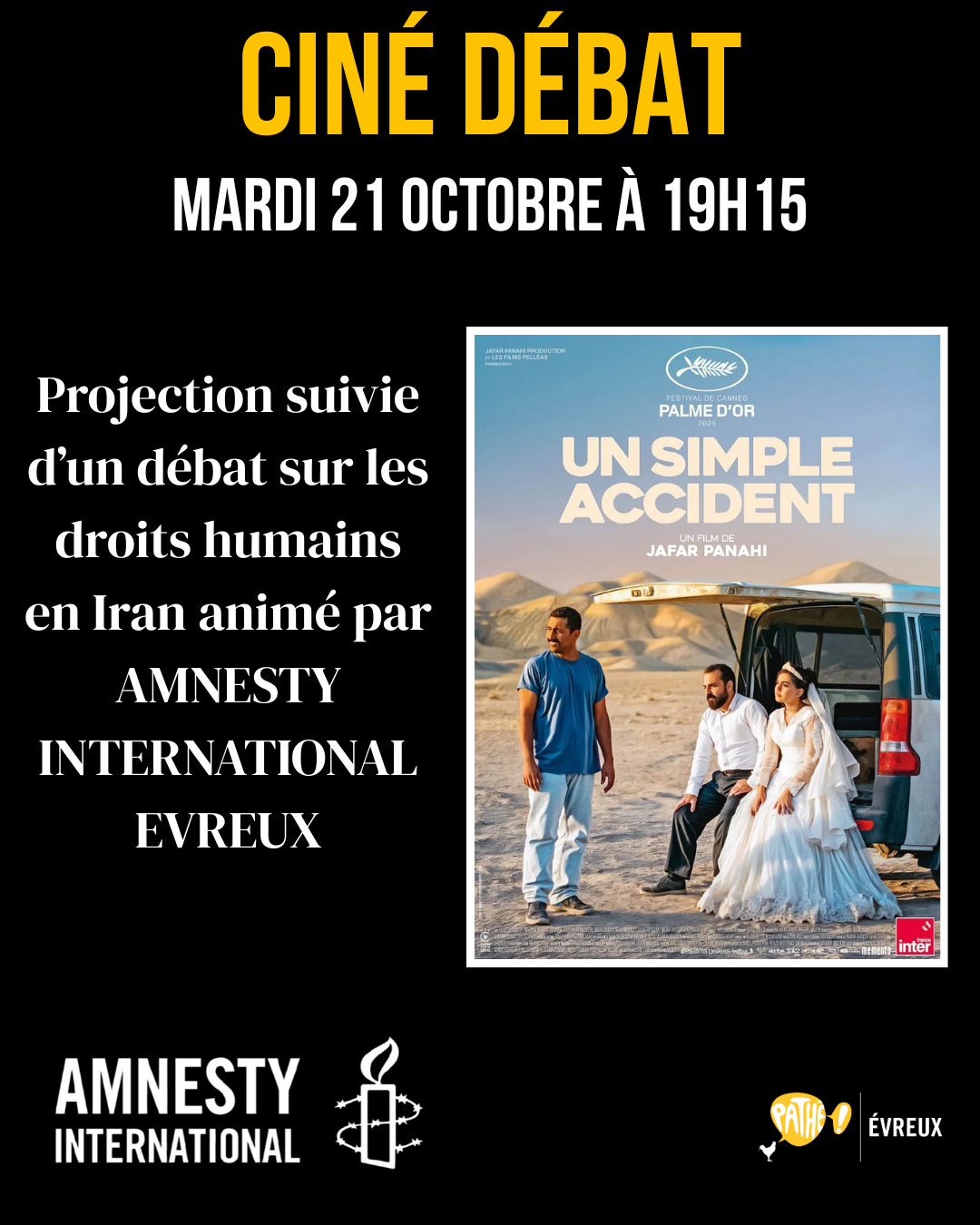 L'actualité des droits humains par Amnesty International-Évreux : France, hommage à Robert Badinter, une vie au service des droits humains . Pourquoi l'abolition universelle de la peine de mort est indispensable : les raisons en 10 questions-réponses, et appel à l'action . Soudan : fuir son pays pour ne pas y mourir . France: un "tri très sélectif" . Bonnes nouvelles et actualités locales : rendez-vous le mardi 21 octobre au cinéma Pathé pour une projection-débat à 19h15 autour du film "Un simple accident".