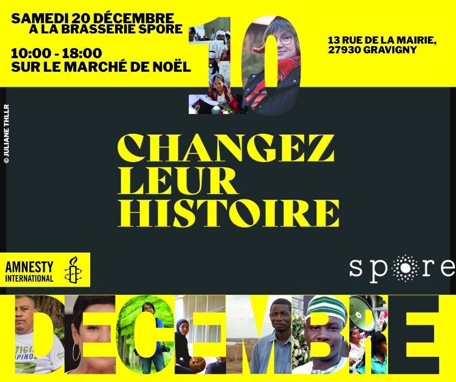 L'actualité des droits humains par Amnesty international-Évreux : campagne "changez leur histoire", défendons les droits de personnes ou communautés bafoués à travers le monde (exemples à Madagascar, au Cambodge...) . Yémen : des migrants sous les bombes américaines . International : attaques contre la Cour pénale internationale, nos droits à la justice menacés . Maroc : la "Gen Z" écrasée . Journée internationale des migrants le 18 décembre : Amnesty s'associe à l'appel lancé par de nombreuses associations pour la défense de leurs droits, et retrouvons-nous à Évreux jeudi 18 à 17h30 place Armand Mandle (rassemblement et marche) .Infos locales : stand de signatures "changez leur histoire" au Marché de Noël de la brasserie Spore à Gravigny samedi 20 décembre ...